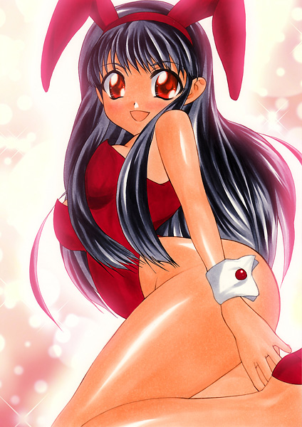 1girlanimal earsbare legsblack hairfake animal earsfemale focuslong hairplayboy bunnyrabbit earsred eyessolowrist cuffs