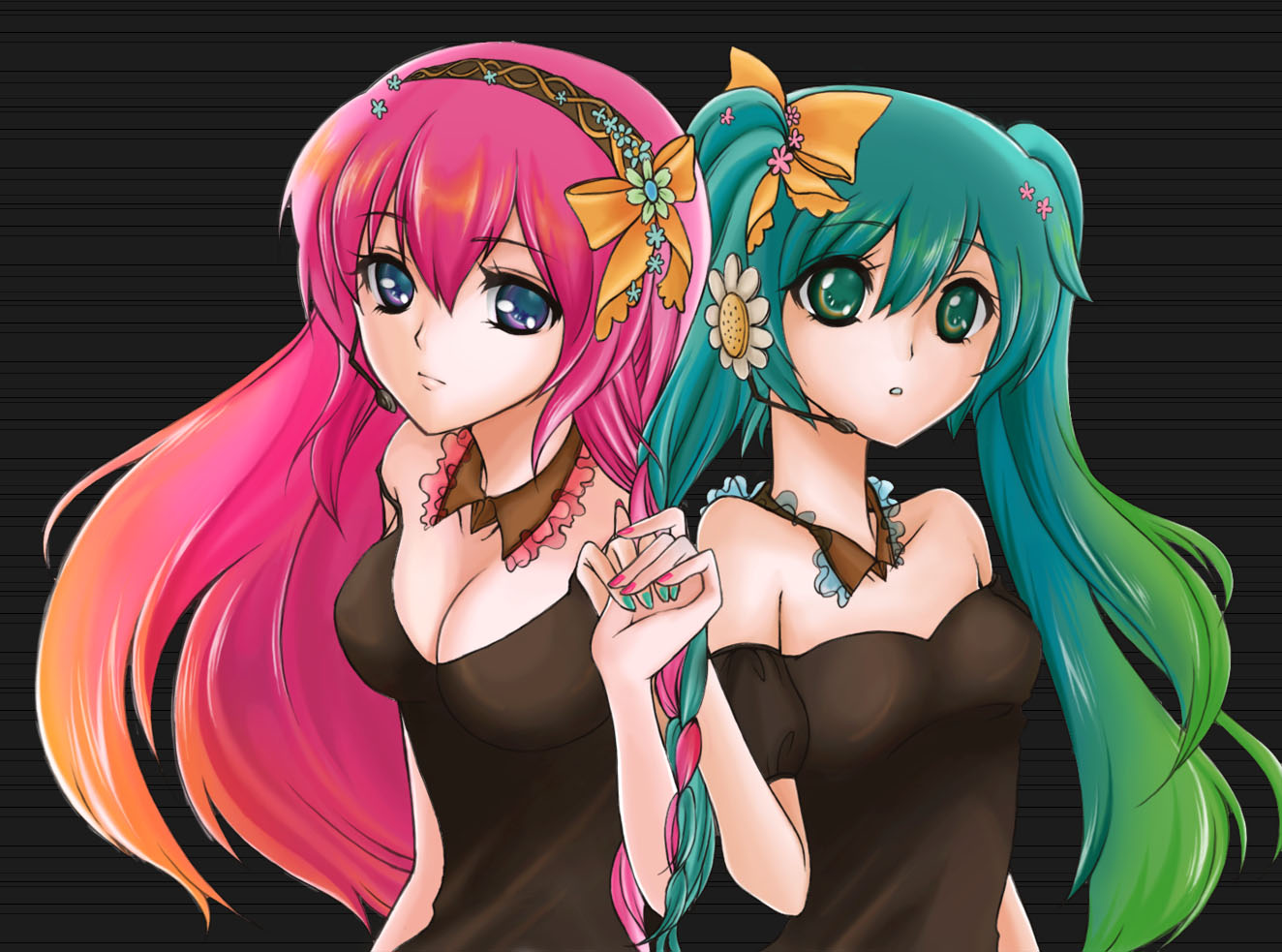 2girlsaqua eyesaqua hairbare shouldersblack backgroundblack dressblue eyesbreastscleavagedetached collardressfemale focusflowergradient hairhairbandholding handslong hairmicrophonemulticolored hairmultiple girlsnail polishpink hairstrap sliptwintailsyuri