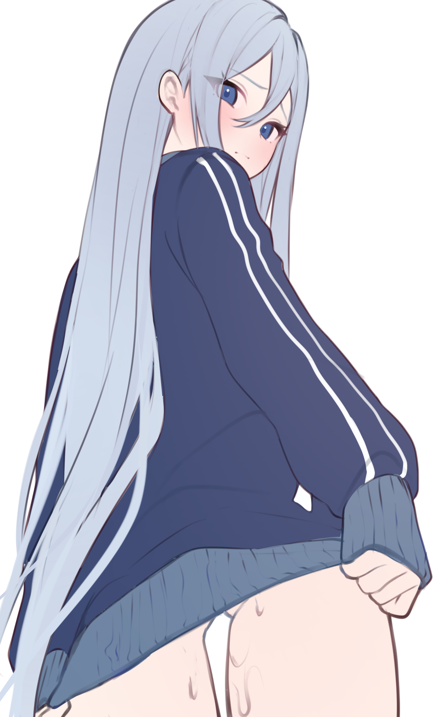 1girlblue eyesblue hairblue jacketblushbottomlessclosed mouthcowboy shotdouble vertical stripedouble-parted bangsembarrassedeyes visible through hairfrom behindfrom belowgluteal foldhair between eyeshair intakesjacketjacket tuglight frownlong hairlong sleeveslooking at viewerlooking backpuffy long sleevespuffy sleevespussy juiceraised inner eyebrowssimple backgroundsleeves past wristssolostandingstraight hairvery long hairwhite background