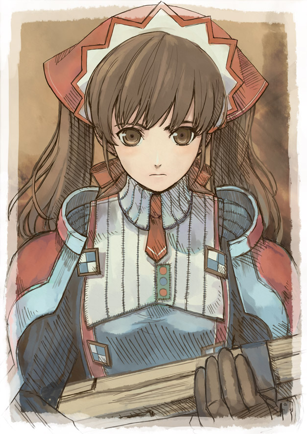 tomimon, rice shower (umamusume), umamusume, commentary request, highres, 1girl, animal ears, brown background, brown dress, brown hair, brown ribbon, closed mouth, collared dress, dress, hair over one eye, hair ribbon, hairband, horse ears, long hair, looking at viewer, neck ribbon, purple eyes, ribbon, round image, smile, solo, upper body, white background, white hairband, white ribbon