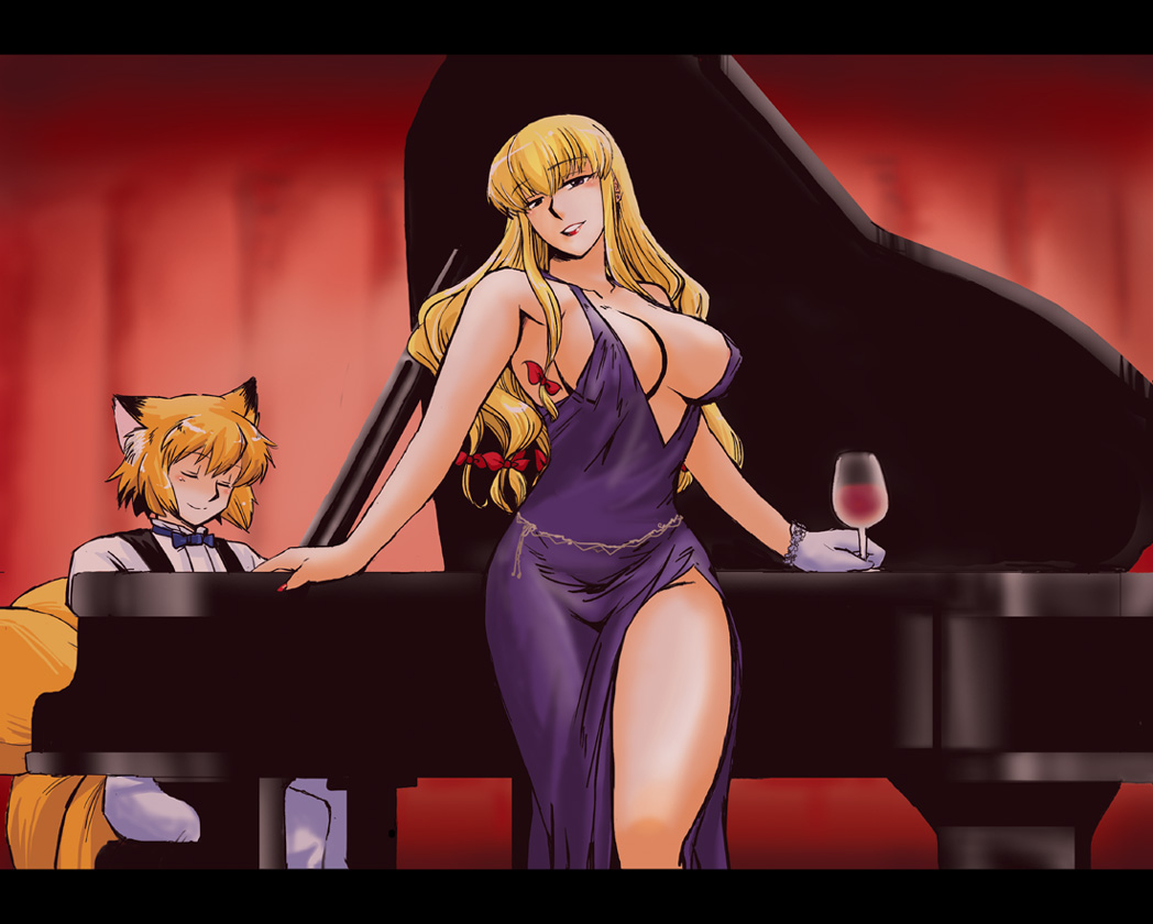 2girlsalcoholalternate costumeanimal earsblonde hairbreastscenter openingcleavagecontemporarycupcurvydressdrinkdrinking glassevening gownfemale focusformal clothesfox earsfox tailglovesgrand pianoimpossible clothesimpossible dressindoorsinstrumentlarge breastsletterboxedlipsticklong hairlooking at viewermakeupmultiple girlsno headwearpianoside slitsingle glovesmiletailwhite gloveswinewine glass